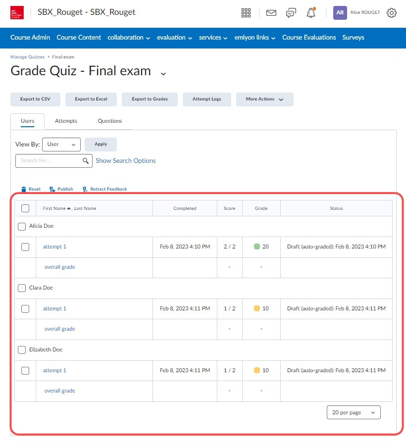 Here you will find the list of students who have completed the quiz, along with their attempt(s).