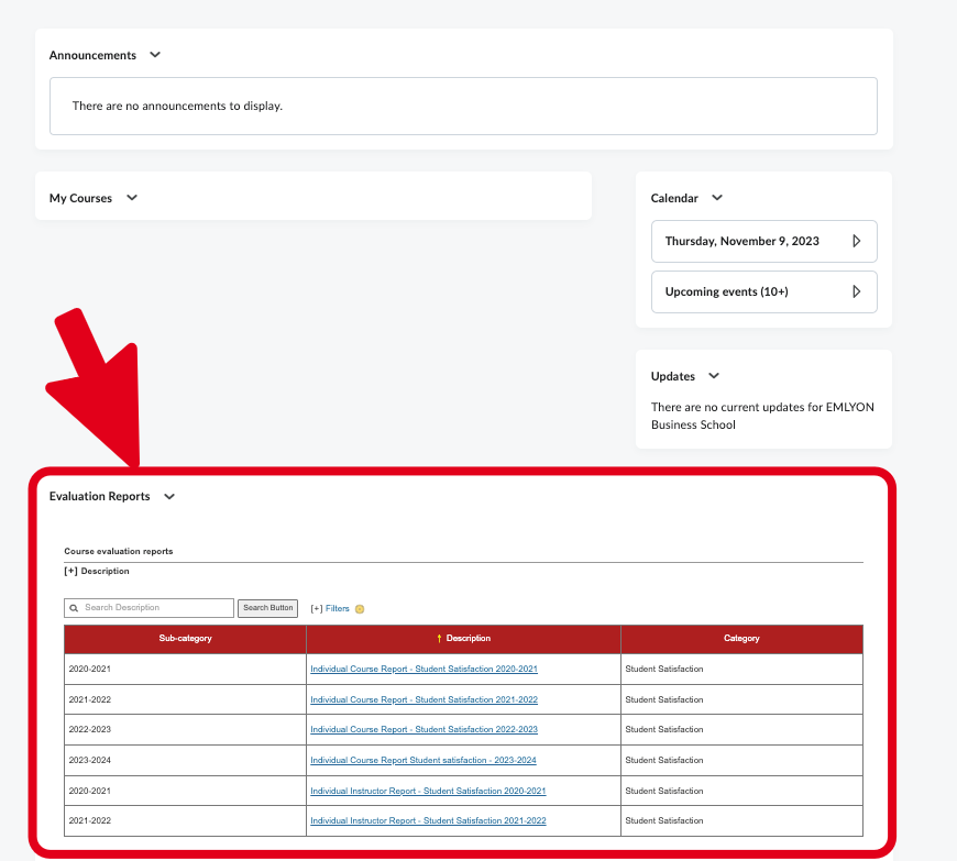 To view your course evaluations, go to your Brightspace home page, and at the bottom of that page you'll find a list of your available evaluation reports.