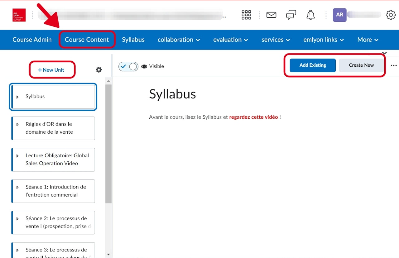 Cliquez sur "New Unit" si vous voulez créer des "unités", qui sont des blocs pour organiser votre cours.