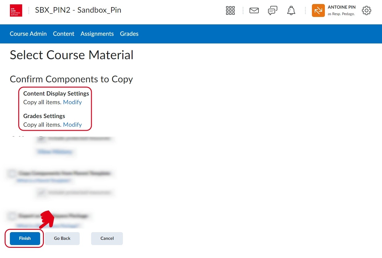 Dans cet exemple j'ai choisi Content Display Settings et Grades Settings.